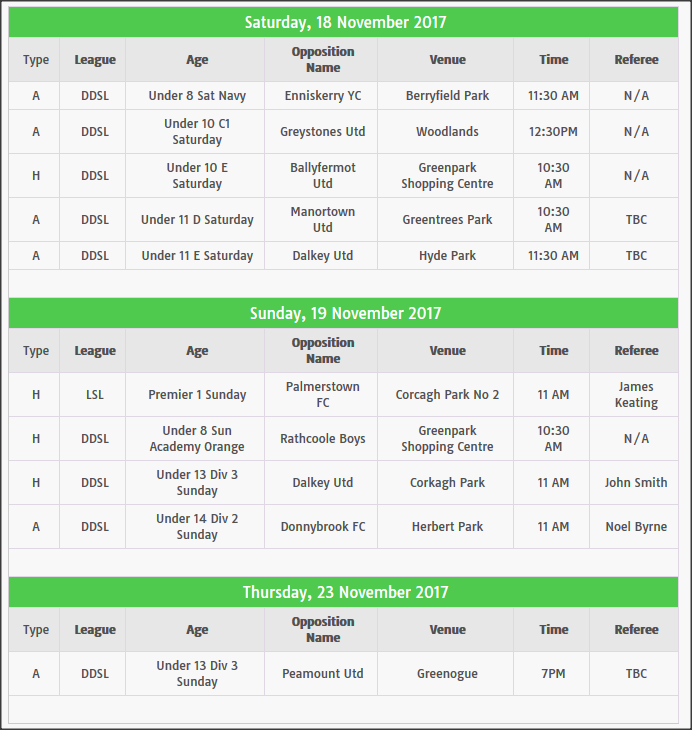 Fixtures November 17th to 24th 2017
