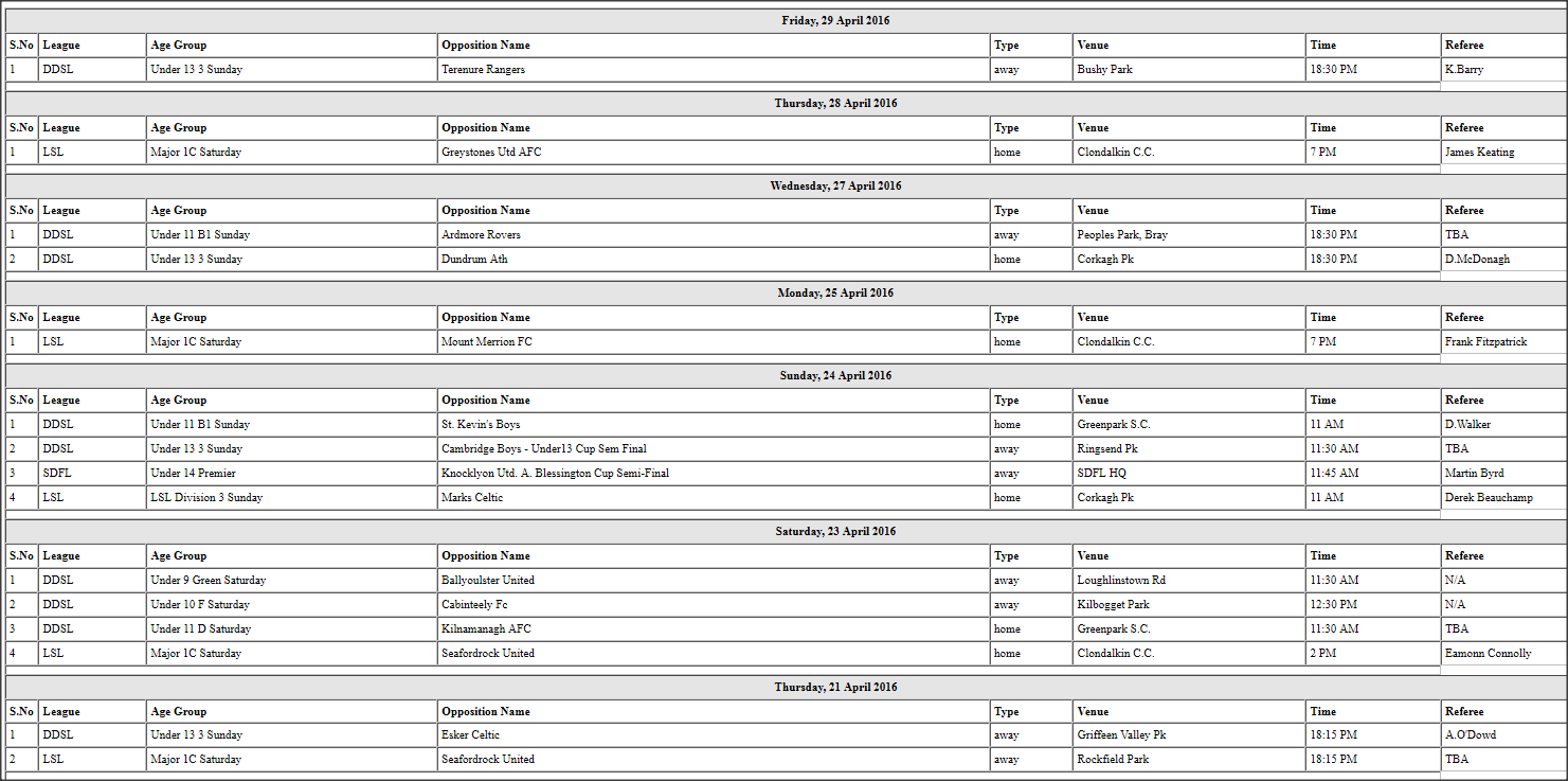 BRCFC Latest Fixtures April 19th - 29th, 2016